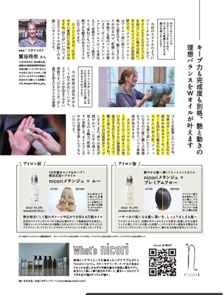 美容師向け雑誌『BOB』2026年1月号にて、nicoriが提案するWオイルメソッドによるオススメのスタイリングや使い方を 鷺谷 玲奈のインタビューと共に掲載されております。